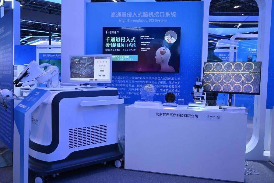 在中关村论坛的常设展区,智冉科技展出了其最新研发的1024通道柔性脑机接口系统及配套的神经外科植入手术机器人,涵盖了从底层硬件、解码算法到临床植入的全链条技术。